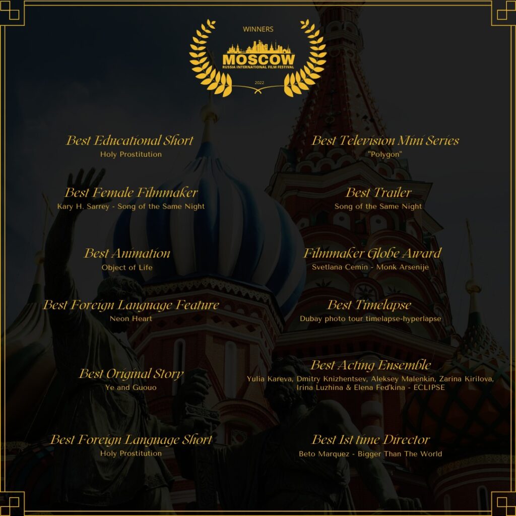 On behalf of the committee, we want to thank you for your participation at the prestigious Moscow Russia International Film Festival which would not exist without the tremendous support and engagement of the international filmmaking and artists community.